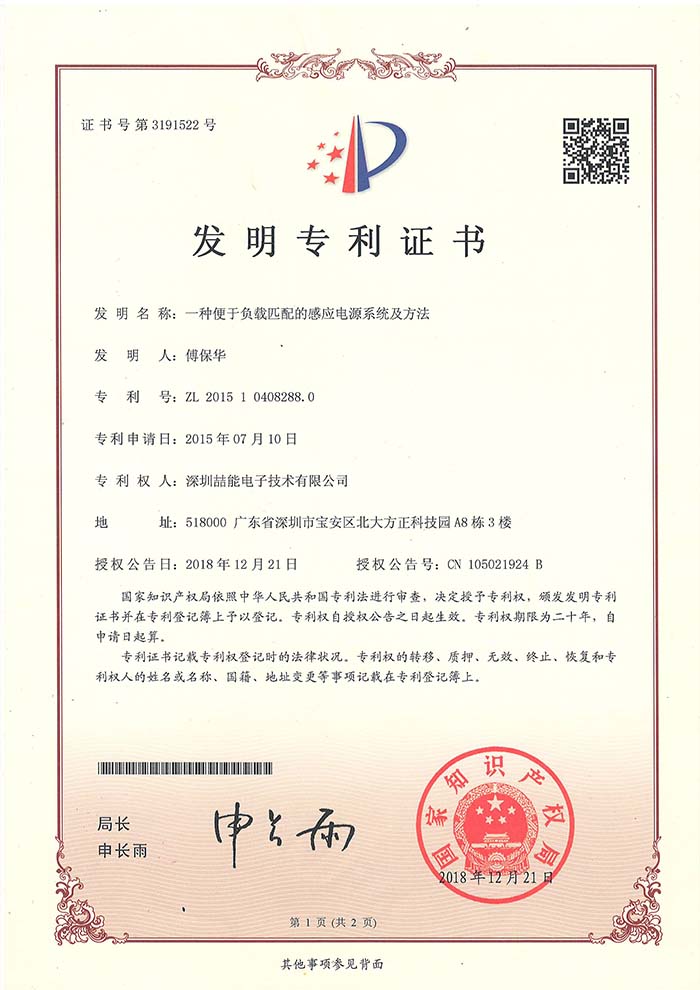 發(fā)明專利證書:一種便于負載匹配的感應電源系統(tǒng)及方法